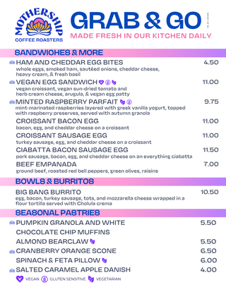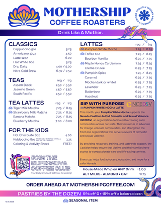 Our menu evolves with the seasons, updated on the 1st of every month to bring you fresh, high-quality ingredients and bold, creative flavors. Each month, we also highlight a new Sip With Purpose partner, giving you the chance to make a meaningful impact with every cup. From our thoughtfully sourced coffee to scratch-made pastries and seasonal specials, Mothership Coffee delivers an experience rooted in quality, creativity, and connection.
